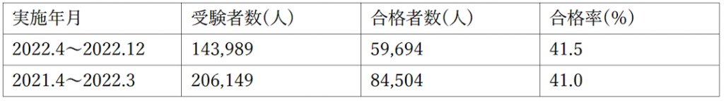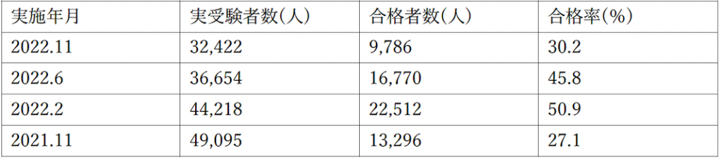 2020年〜2021年にかけて試験時間の変更や出題傾向の変化があり、一時的に合格率が低くなっていますが、合格率の平均は例年40〜50%となっています。